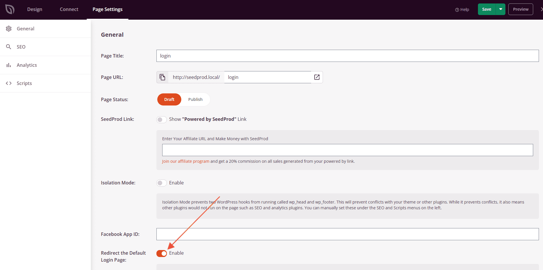 - To redirect the default WordPress login page to your custom page, simply activate the Redirect the Default Login Page setting. Using the Redirect the Default Login Page option will redirect most visits from